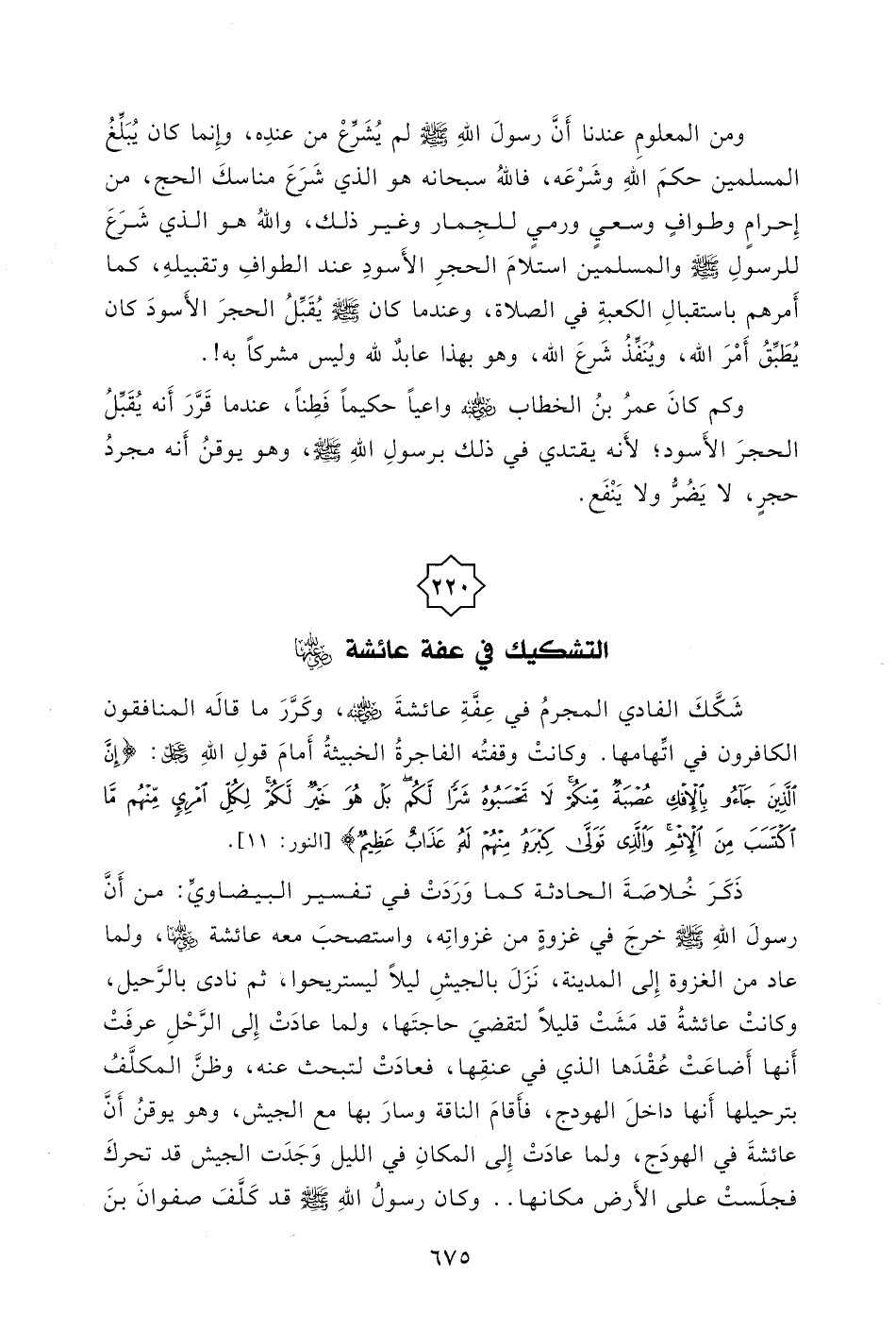 رسولَ اللهِ - صلى الله عليه وسلم - خرجَ في غزوةٍ من غزواتِه، واستصحبَ معه عائشة - رضي الله عنها -، ولما عاد من الغزوة إِلى المدينة، نَزَلَ بالجيشِ ليلاً ليستريحوا، ثم نادى بالرَّحيل، وكانتْ عائشةُ قد مَشَتْ قليلاً لتقضيَ حاجتَها، ولما عادَتْ إِلى الرَّحْلِ عرفَتْ أَنها أَضاعَتْ عُقْدَها الذي في عنقِها، فعادَتْ لتبحث عنه، وظنَّ المكلَّفُ بترحيلها أَنها داخلَ الهودج، فأَقامَ الناقة وسارَ بها مع الجيش، وهو يوقنُ أَنَّ عائشةَ في الهودَج، ولما عادَتْ إِلى المكانِ في الليل وَجَدَت الجيش قد تحركَ فجلَستْ على الأَرض مكانها..