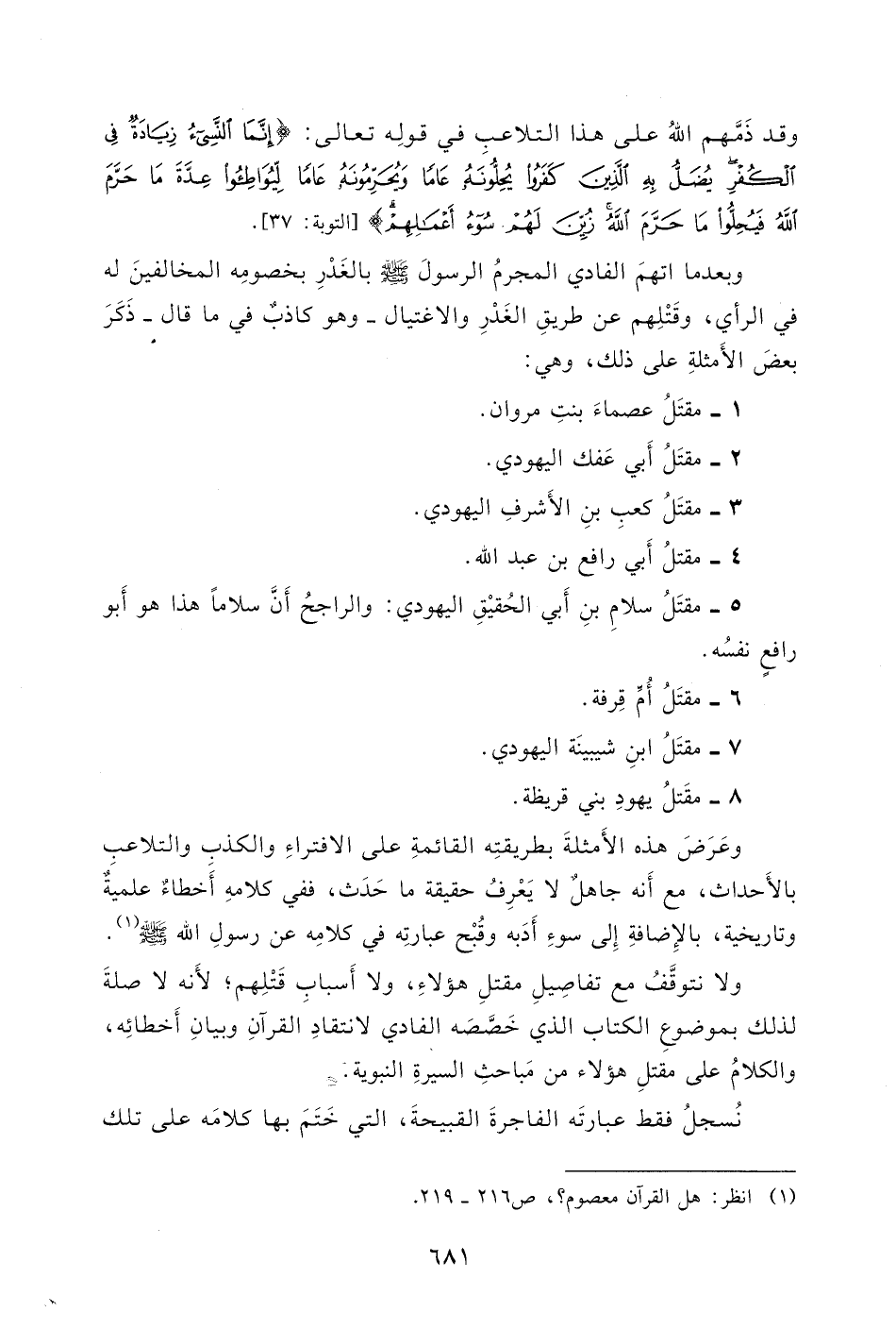 وبعدما اتهمَ الفادي المجرمُ الرسولَ - صلى الله عليه وسلم - بالغَدْرِ بخصومِه المخالفينَ له في الرأي، وقَتْلِهم عن طريقِ الغَدْرِ والاغتيال - وهو كاذبٌ في ما قال - ذَكَرَ بعضَ الأَمثلةِ على ذلك، وهي: