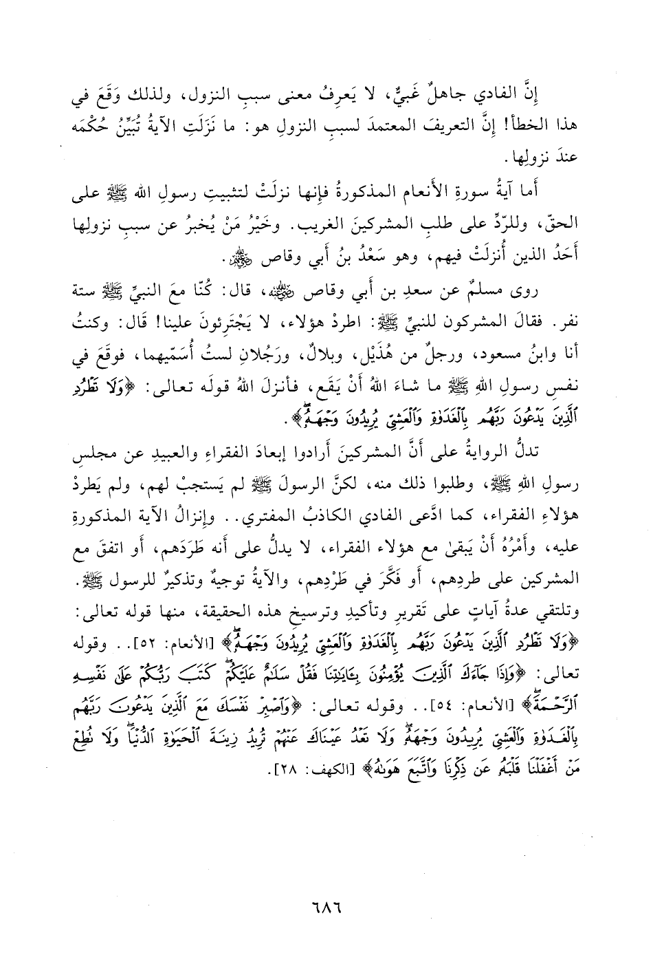 وإِنزالُ الآية المذكورةِ عليه، وأَمْرُهُ أَنْ يَبقى مع هؤلاء الفقراء، لا يدلُّ على أَنه طَرَدَهم، أَو اتفقَ مع المشركين على طردهم، أَو فَكَّرَ في طَرْدِهم، والآيةُ توجيهٌ وتذكيرٌ للرسول - صلى الله عليه وسلم -.