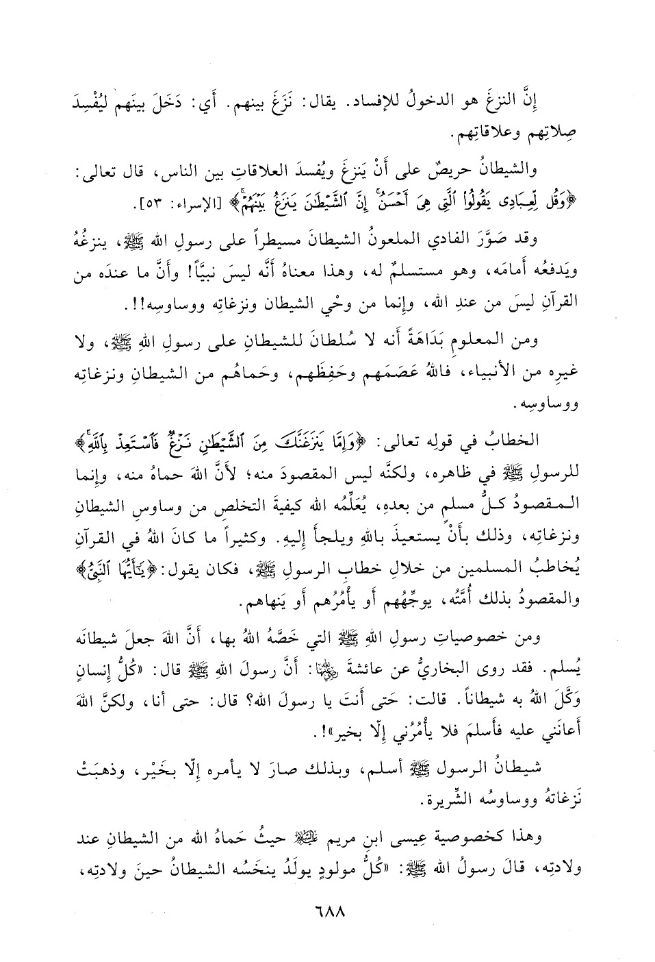 ومن المعلومِ بَدَاهَةً أَنه لا سُلطانَ للشيطانِ على رسولِ اللهِ - صلى الله عليه وسلم -، ولا غيرِه من الأنبياء، فاللهُ عَصَمَهم وحَفِظَهم، وحَماهُم من الشيطانِ ونزغاتِه ووساوسِه.
