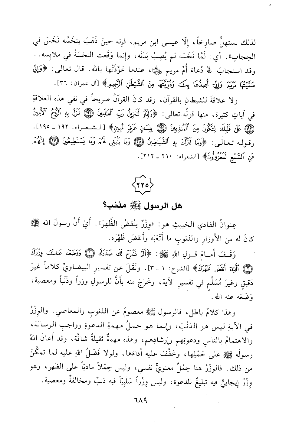 ونَقَلَ عن تفسيرِ البيضاويِّ كلاماً غيرَ دَقيقٍ وغيرَ مُسَلَّمٍ في تفسيرِ الآية، وخَرَجَ منه بأَنَّ للرسولِ وزراً وذَنْباً ومعصية، وَضَعَه عنه الله.