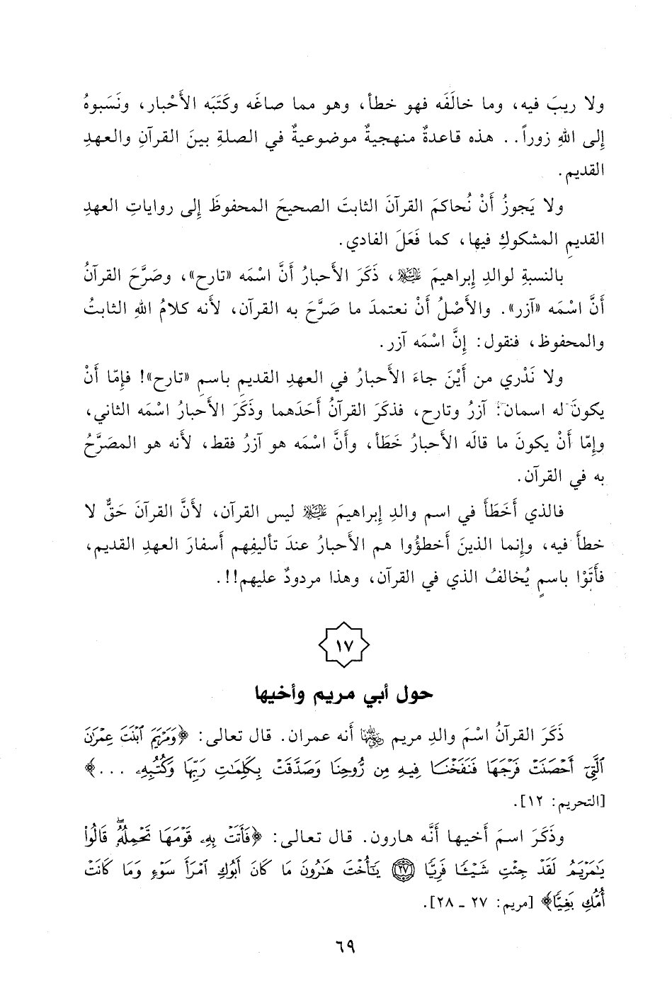 فالذي أَخَطَأَ في اسم والدِ إِبراهيمَ - صلى الله عليه وسلم - ليس القرآن، لأَنَّ القرآنَ حَقّ لا خطأَ - فيه، وإِنما الذينَ أَخطؤُوا هم الأَحبارُ عندَ تأليفِهم أَسفارَ العهدِ القديم، فأَتَوْا باسمٍ يُخالفُ الذي في القرآن، وهذا مردودٌ عليهم!!.