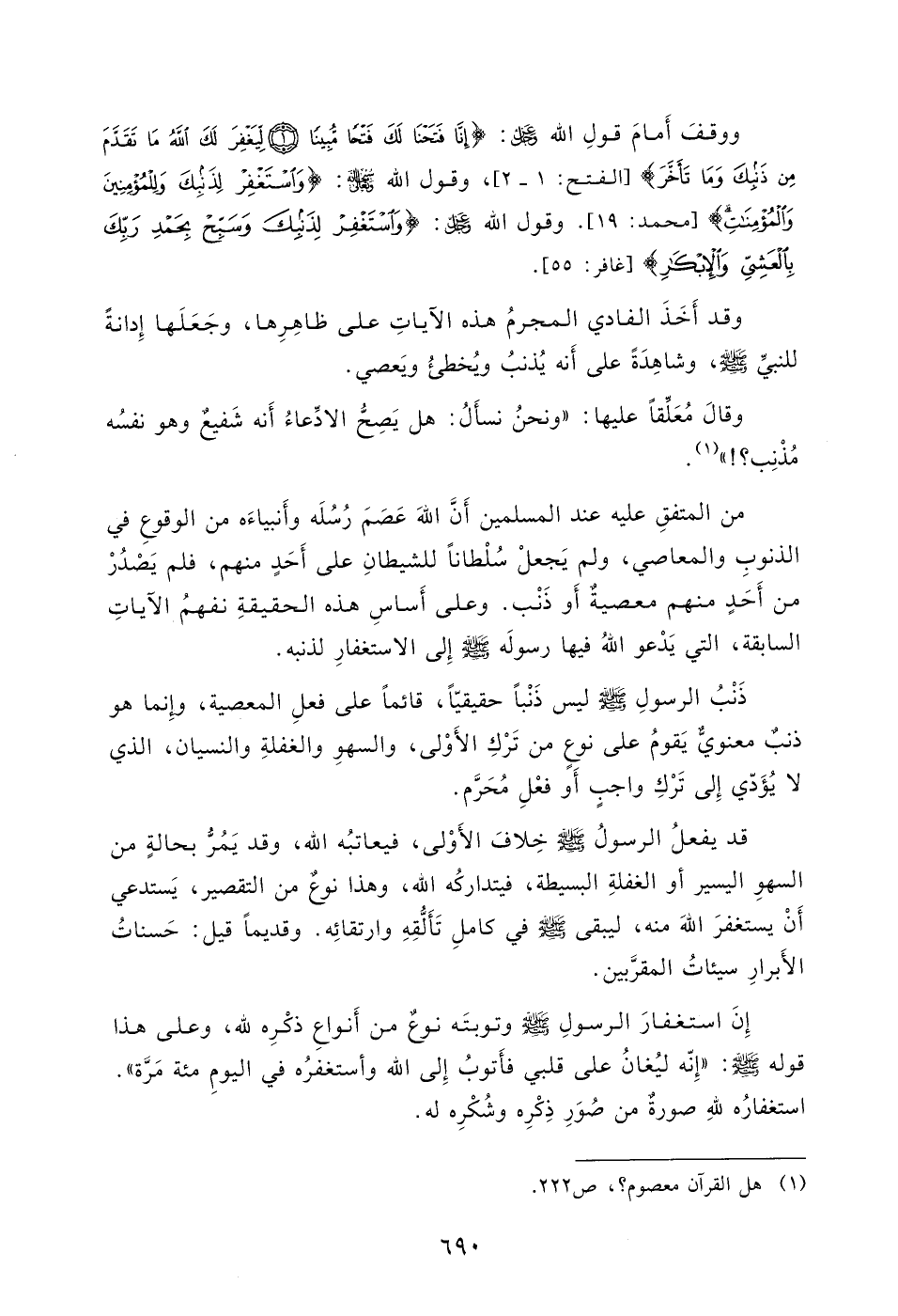 ووقفَ أَمامَ قولِ الله - عز وجل - (إِنَّا فَتَحْنَا لَكَ فَتْحًا مُبِينًا (1) لِيَغْفِرَ لَكَ اللَّهُ مَا تَقَدَّمَ مِنْ ذَنْبِكَ وَمَا تَأَخَّرَ) (1) ، وقول الله - عز وجل -: (وَاسْتَغْفِرْ لِذَنْبِكَ وَلِلْمُؤْمِنِينَ وَالْمُؤْمِنَاتِ) .