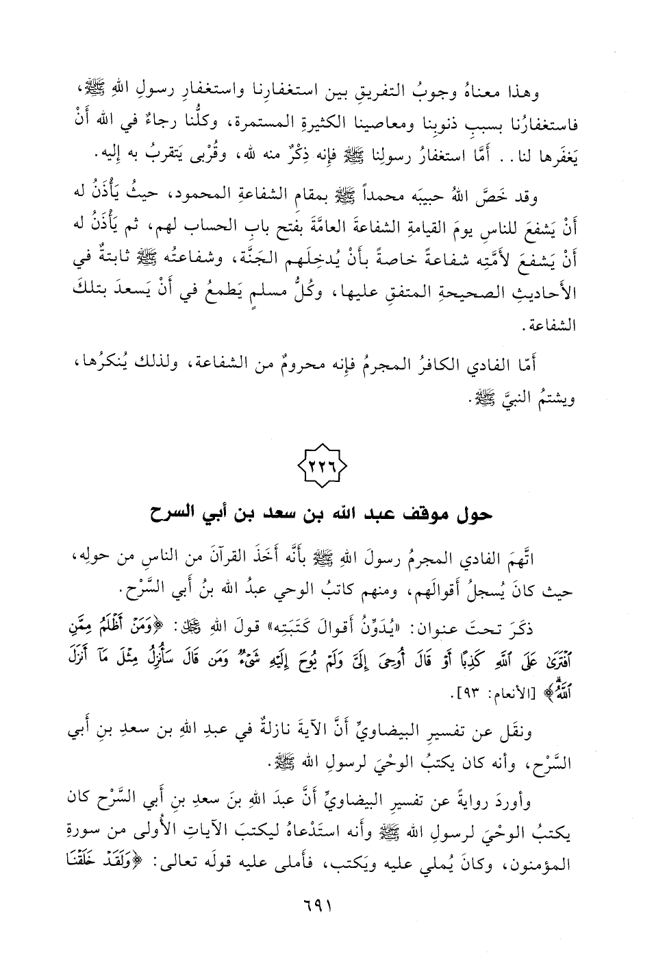 وأوردَ روايةً عن تفسيرِ البيضاويِّ أَنَّ عبدَ اللهِ بنَ سعدِ بنِ أَبي السَّرْح كان