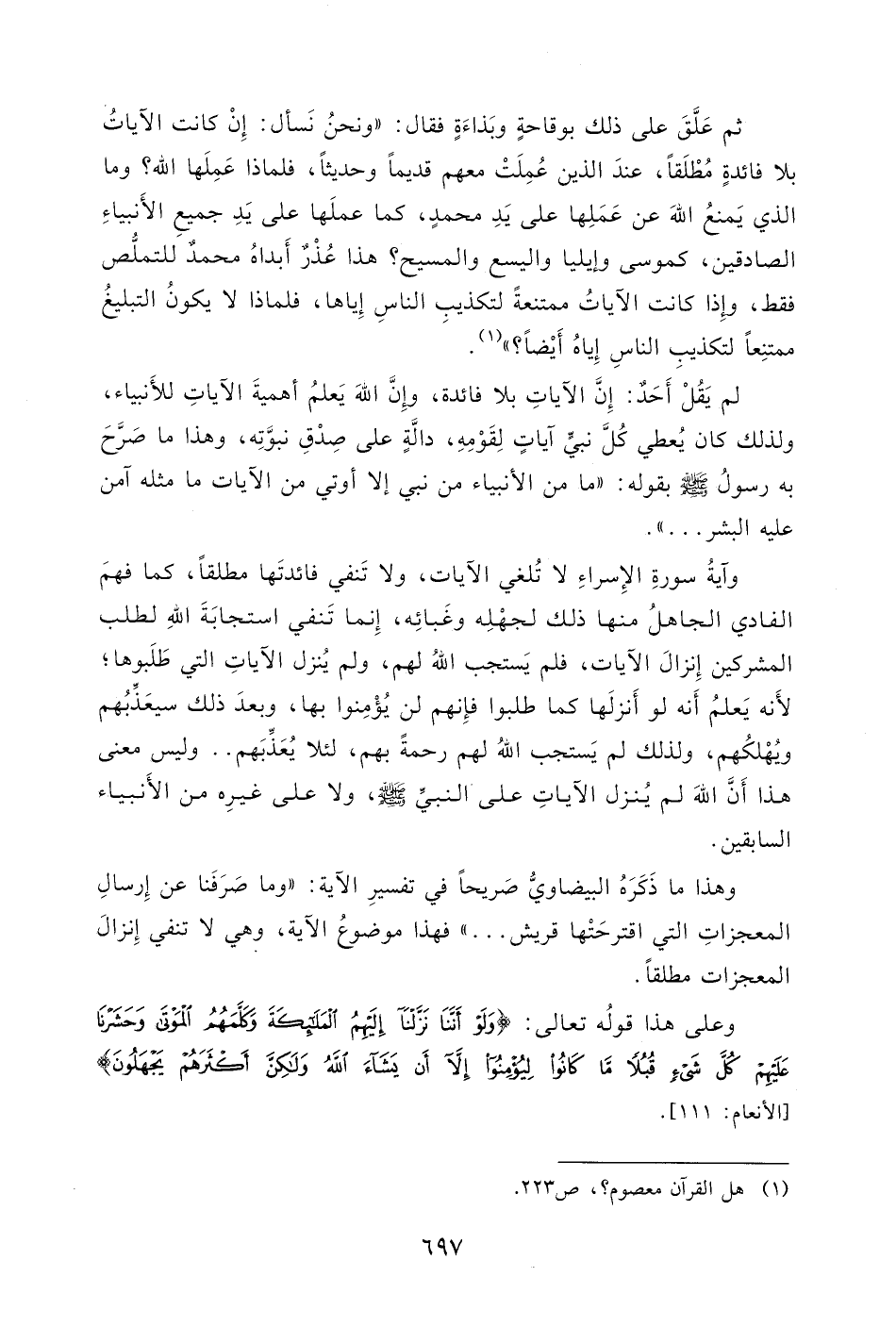 هذا عُذْرٌ أَبداهُ محمدٌ للتملُّص فقط، وإِذا كانت الآيات ُ ممتنعةً لتكذيبِ الناسِ إِياها، فلماذا لا يكونُ التبليغُ ممتنِعاً لتكذيبِ الناسِ إِياهُ أَيْضاً؟ ".