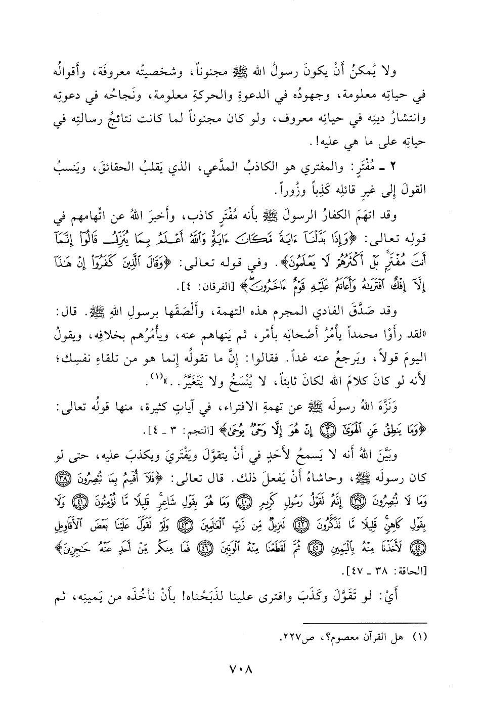 قال تعالى: (فَلَا أُقْسِمُ بِمَا تُبْصِرُونَ (38) وَمَا لَا تُبْصِرُونَ (39) إِنَّهُ لَقَوْلُ رَسُولٍ كَرِيمٍ (40) وَمَا هُوَ بِقَوْلِ شَاعِرٍ قَلِيلًا مَا تُؤْمِنُونَ (41) وَلَا بِقَوْلِ كَاهِنٍ قَلِيلًا مَا تَذَكَّرُونَ (42) تَنْزِيلٌ مِنْ رَبِّ الْعَالَمِينَ (43) وَلَوْ تَقَوَّلَ عَلَيْنَا بَعْضَ الْأَقَاوِيلِ (44) لَأَخَذْنَا مِنْهُ بِالْيَمِينِ (45) ثُمَّ لَقَطَعْنَا مِنْهُ الْوَتِينَ (46) فَمَا مِنْكُمْ مِنْ أَحَدٍ عَنْهُ حَاجِزِينَ (47) .