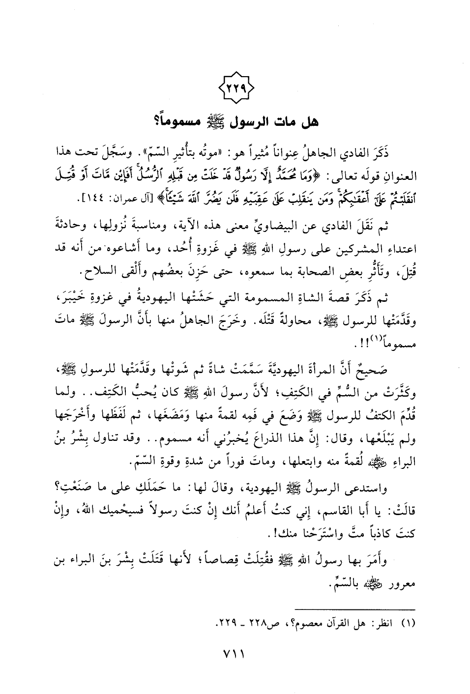 وخَرَجَ الجاهلُ منها بأَنَّ الرسولَ - صلى الله عليه وسلم - ماتَ مسموما" (1) .
