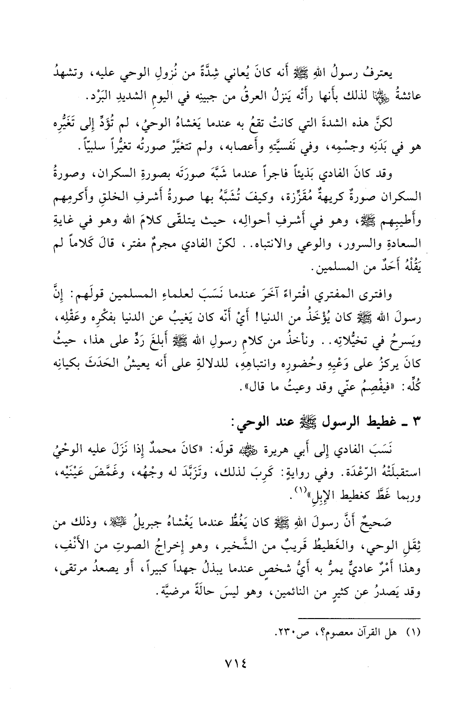 نَسَبَ الفادي إِلى أَبي هريرة - رضي الله عنه - قولَه: " كانَ محمدٌ إِذا نَزَلَ عليه الوحْيُ استقبلَتْهُ الرّعْدَة.