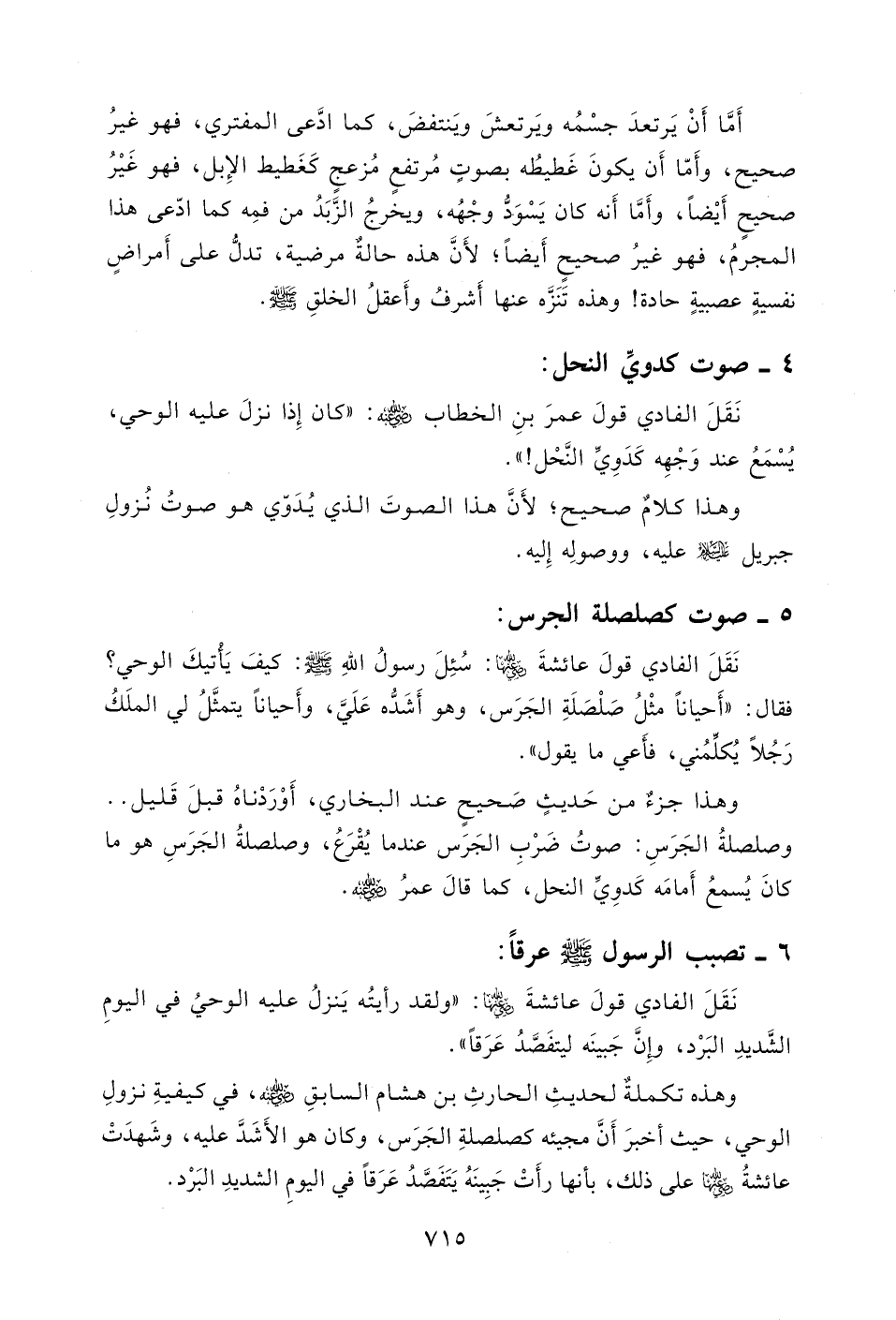 نَقَلَ الفادي قولَ عائشةَ - رضي الله عنها -: "ولقد رأيتُه يَنزلُ عليه الوحيُ في اليومِ الشَّديدِ البَرْد، وإِنَّ جَبينَه ليتفَصدُ عَرَقاً ".