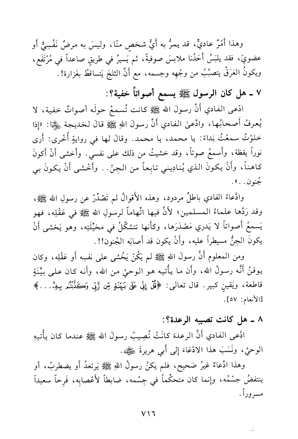 وادَّعاءُ الفادي باطلٌ مردود، وهذه الأَقوال لم تَصْدُرْ عن رسول الله - صلى الله عليه وسلم -، وقد رَدَّها علماءُ المسلمين؛ لأَنَ فيها اتِّهاماً لرسول الله - صلى الله عليه وسلم - في عَقْلِه، فهو يَسمعُ أَصواتاً لا يَدري مَصْدَرَها، وكأَنها تتشكَّلُ في مخيِّلَتِه، وهو يَخشى أَنْ يكونَ الجِنُّ مسيطراً عليه، وأَنْ يكون قد أَصابَه الجُنون!!.