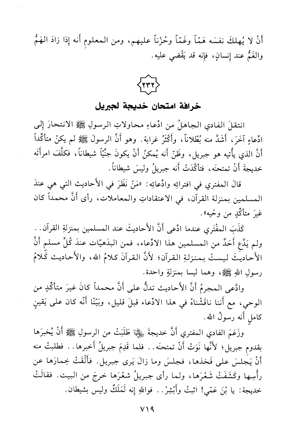 وزَعَمَ الفادي المفترِي أَنَّ خديجةَ - رضي الله عنها - طَلَبَتْ من الرسولِ - صلى الله عليه وسلم - أَن يُخبرَها بقدومِ جبريل، لأَنَّها نَوَتْ أَنْ تمتحنَه..
