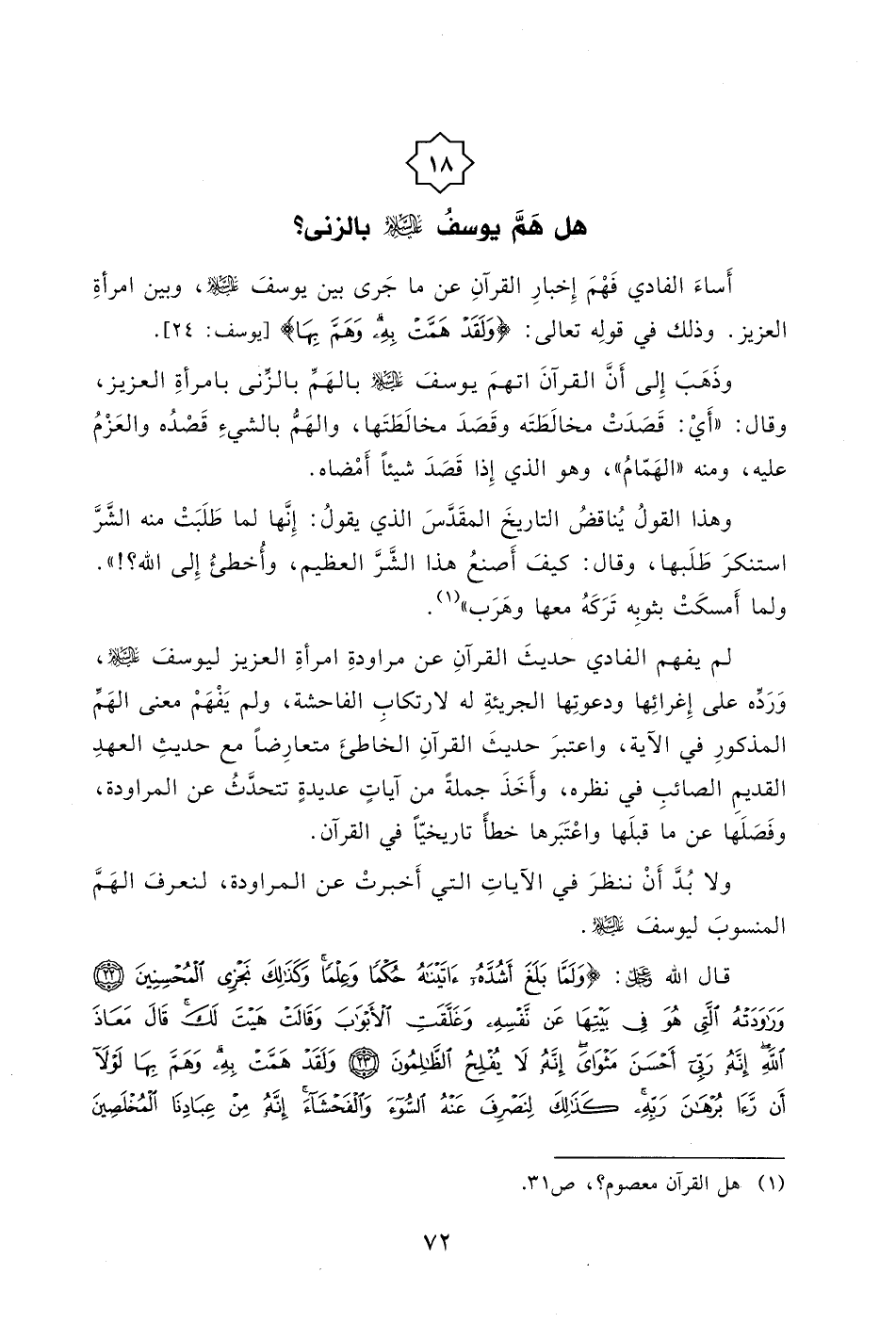 وذَهَبَ إِلى أَنَّ القرآنَ اتهمَ يوسفَ - صلى الله عليه وسلم - بالهَمِّ بالزنى بامرأةِ العزيز، وقال: " أَيْ: قَصدَتْ مخالَطتَه وقَصدَ مخالَطَتَها، والهَمُّ بالشيءِ قَصدُه والعَزْمُ عليه، ومنه " الهَمّامُ "، وهو الذي إِذا قَصَدَ شيئاً أَمْضاه.