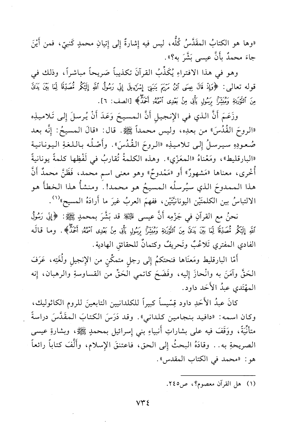 أَمّا البارقليط ومَعنَاها فنحتكمُ إِلى رجلٍ متمكِّنٍ من الإِنجيلِ ولُغَتِه، عَرَفَ
