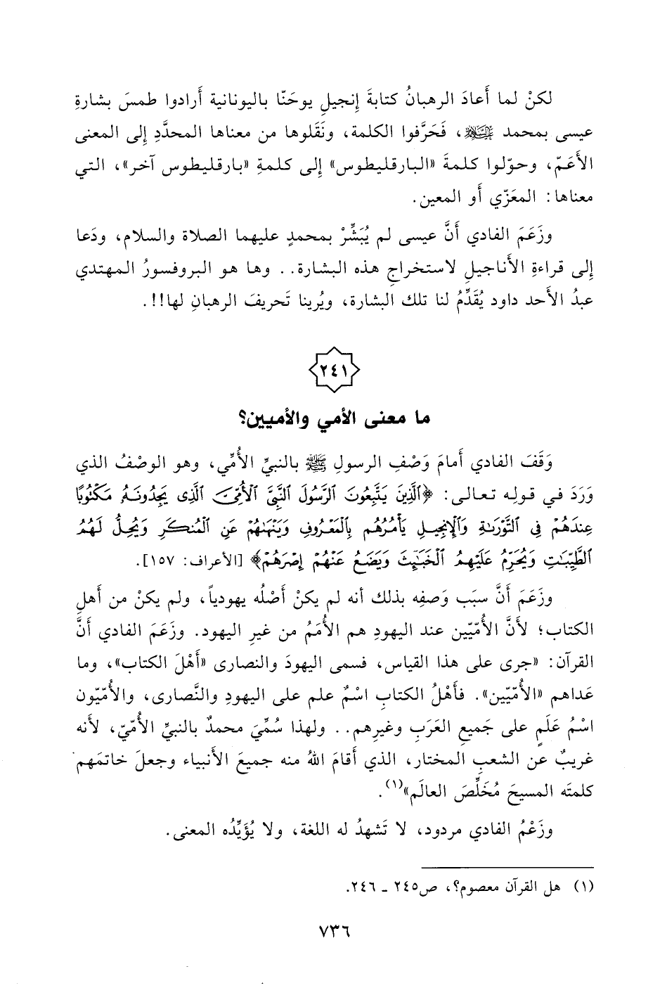وَقَفَ الفادي أَمامَ وَصْفِ الرسولِ - صلى الله عليه وسلم - بالنبيِّ الأُمِّي، وهو الوصْفُ الذي وَرَدَ في قولِه تعالى: (الَّذِينَ يَتَّبِعُونَ الرَّسُولَ النَّبِيَّ الْأُمِّيَّ الَّذِي يَجِدُونَهُ مَكْتُوبًا عِنْدَهُمْ فِي التَّوْرَاةِ وَالْإِنْجِيلِ يَأْمُرُهُمْ بِالْمَعْرُوفِ وَيَنْهَاهُمْ عَنِ الْمُنْكَرِ وَيُحِلُّ لَهُمُ الطَّيِّبَاتِ وَيُحَرِّمُ عَلَيْهِمُ الْخَبَائِثَ وَيَضَعُ عَنْهُمْ إِصْرَهُمْ) .