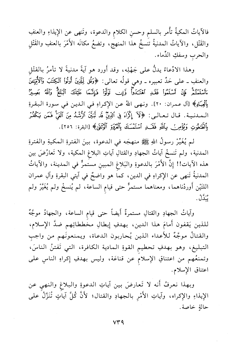 فالآياتُ المكيةُ تأمر بالسلمِ وحسنِ الكلامِ والدعوة، وتَنهى عن الإِيذاءِ والعنفِ والقَتْل، والآياتُ المدنيةُ تنسخُ هذا المنهج، وتضعُ مكانَه الأَمْرَ بالعنفِ والقَتْلِ والحربِ وسفكِ الدّماء.