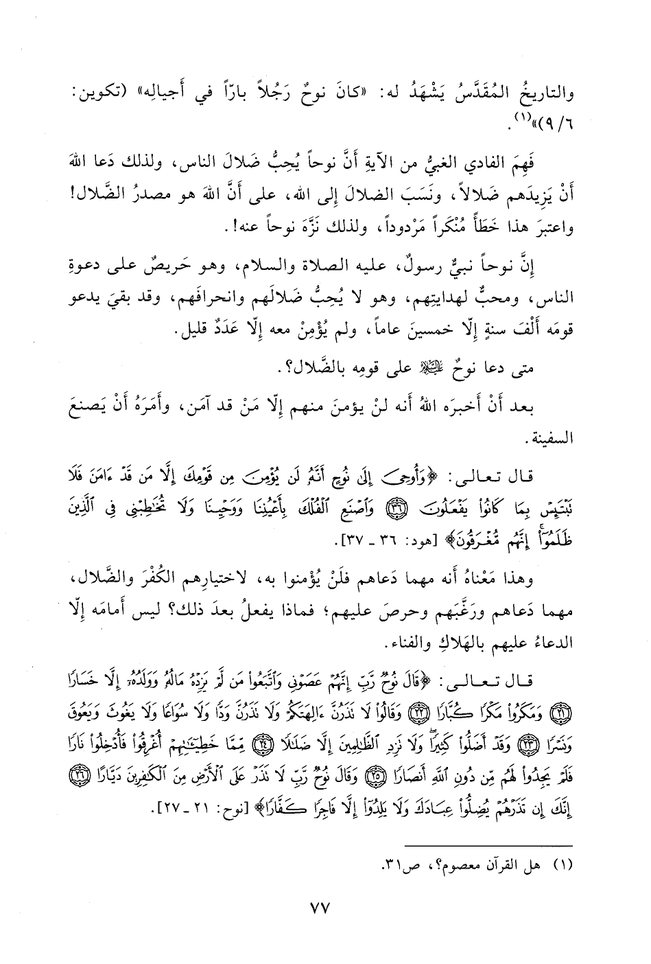 إن نوحاً لم يدع ربه أن يزيد الناس ضلالاً، وإنما دعا على الظالمين من الناس. ومثل ذلك: ما فى التوراة عن الأنبياء فإنهم دعوا على الظالمين، ولم يدعوا على كل الناس. ففى المزمور الثامن عشر: " من الرجل الظالم تنقذنى " - " مثل طين الأسواق؛ اطرحهم "، وفى الإنجيل يقول المسيح لله عن الذين آمنوا به: " احفظهم فى اسمك الذين أعطيتنى " [يو 17: 11] ولم يدع للكل. اهـ (شبهات المشككين) .