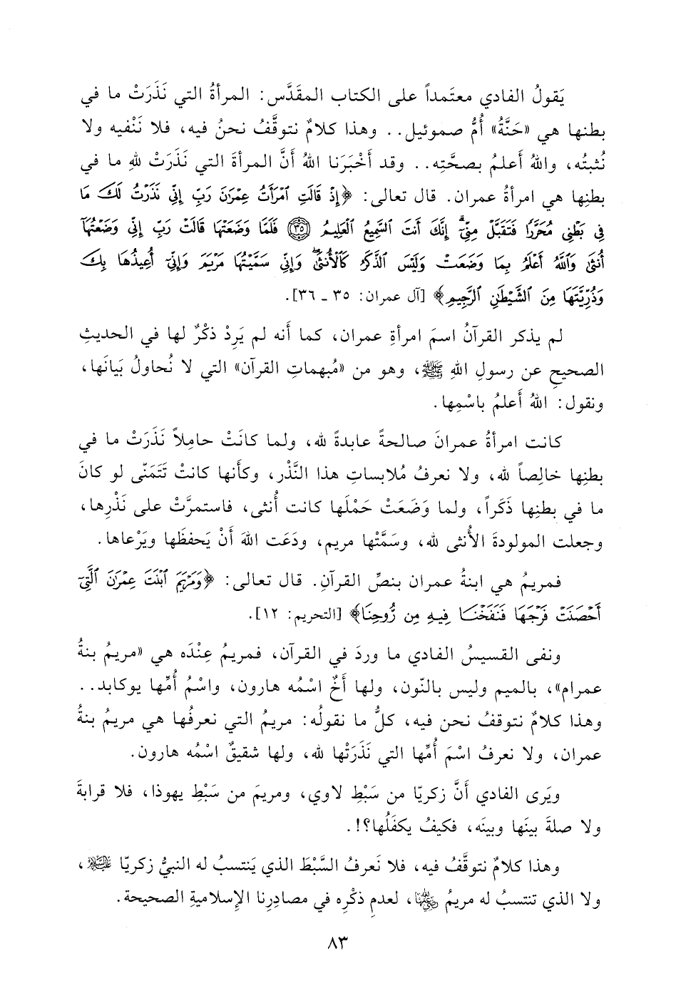 وهذا كلامٌ نتوقَّفُ فيه، فلا نَعرفُ السَّبْطَ الذي يَنتسبُ له النبيُّ زكريّا - عليه السلام -، ولا الذي تنتسبُ له مريمُ - عليها السلام -، لعدمِ ذكْرِه في مصادِرِنا الإِسلاميةِ الصحيحة.