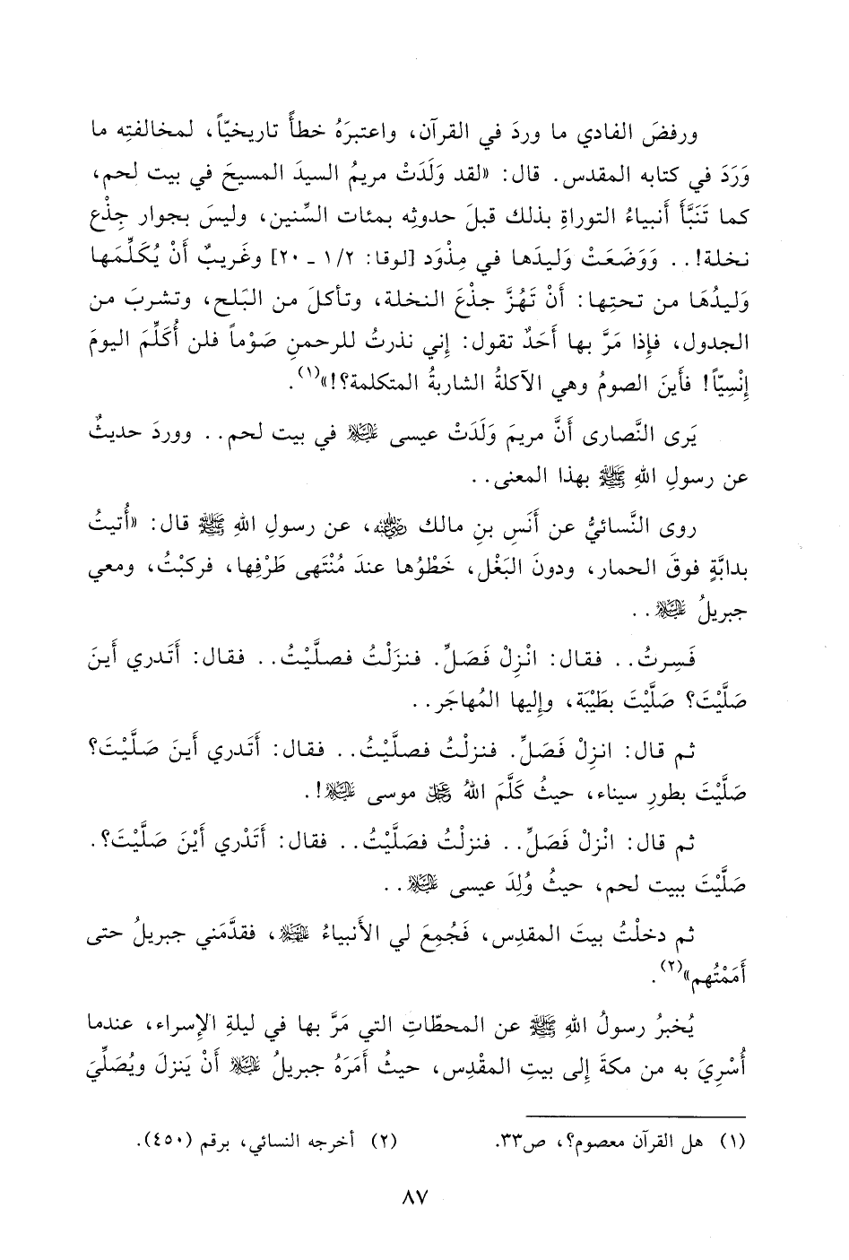 لقد ولدت مريم السيد المسيح فى بيت لحم كما تنبأ أنبياء التوراة بذلك قبل حدوثه بمئات السنين، وليس بجوار جذع نخلة. ووضعت مريم وليدها فى مذود [لوقا 2: 2 - 20] وغريب أن يكلمها وليدها من تحتها: أن تهز جذع النخلة وتأكل من البلح وتشرب من الجدول. فإذا مرّ بها أحد تقول: (إنى نذرت للرحمن صوماً فلن أكلم اليوم إنسيا) (1) فأين الصوم وهى الآكلة الشاربة المتكلمة؟