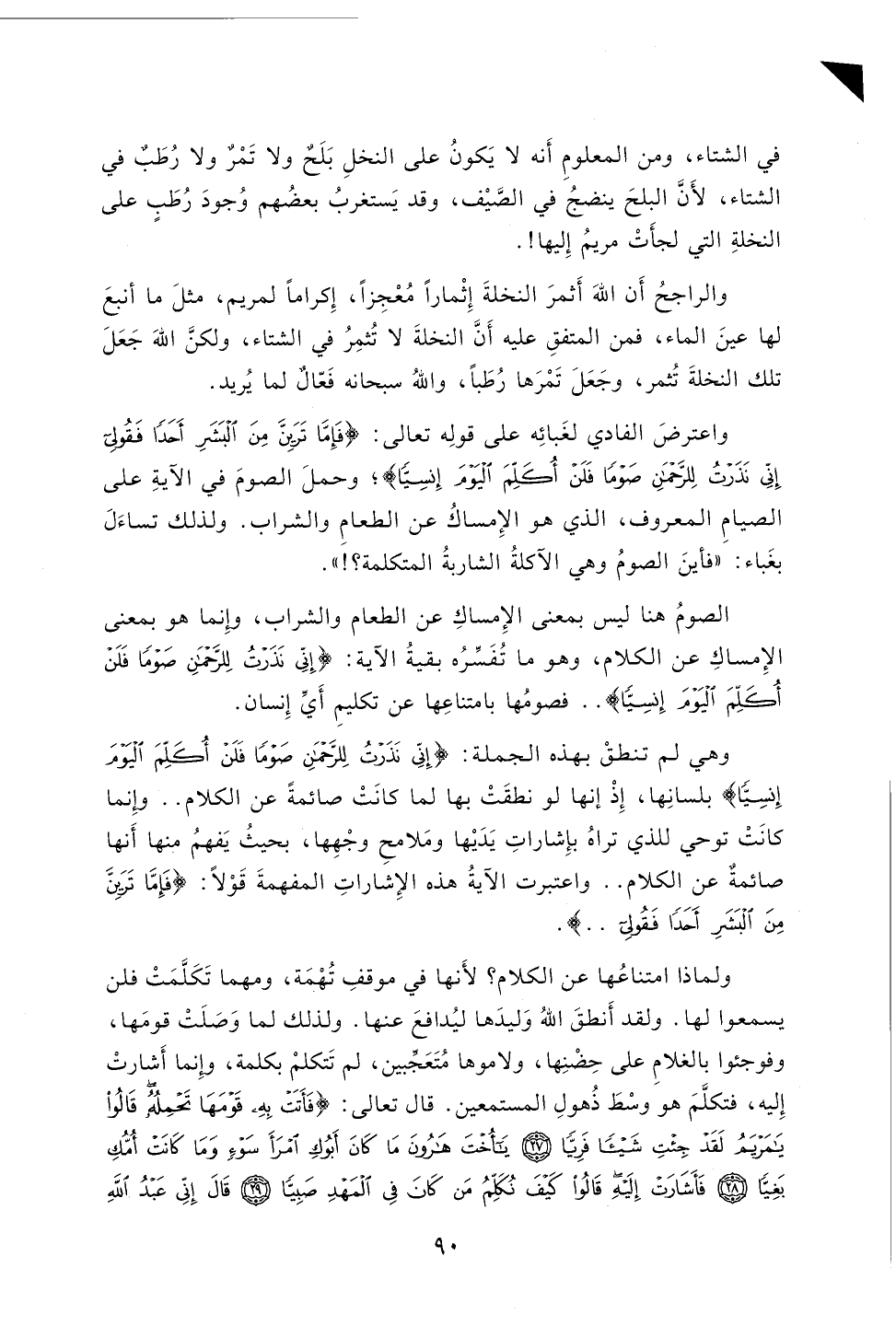 وهي لم تنطقْ بهذه الجملة: (إِنِّي نَذَرْتُ لِلرَّحْمَنِ صَوْمًا فَلَنْ أُكَلِّمَ الْيَوْمَ إِنْسِيًّا) بلسانِها، إِذْ إنها لو نطقَتْ بها لما كانَتْ صائمةً عن الكلام..
