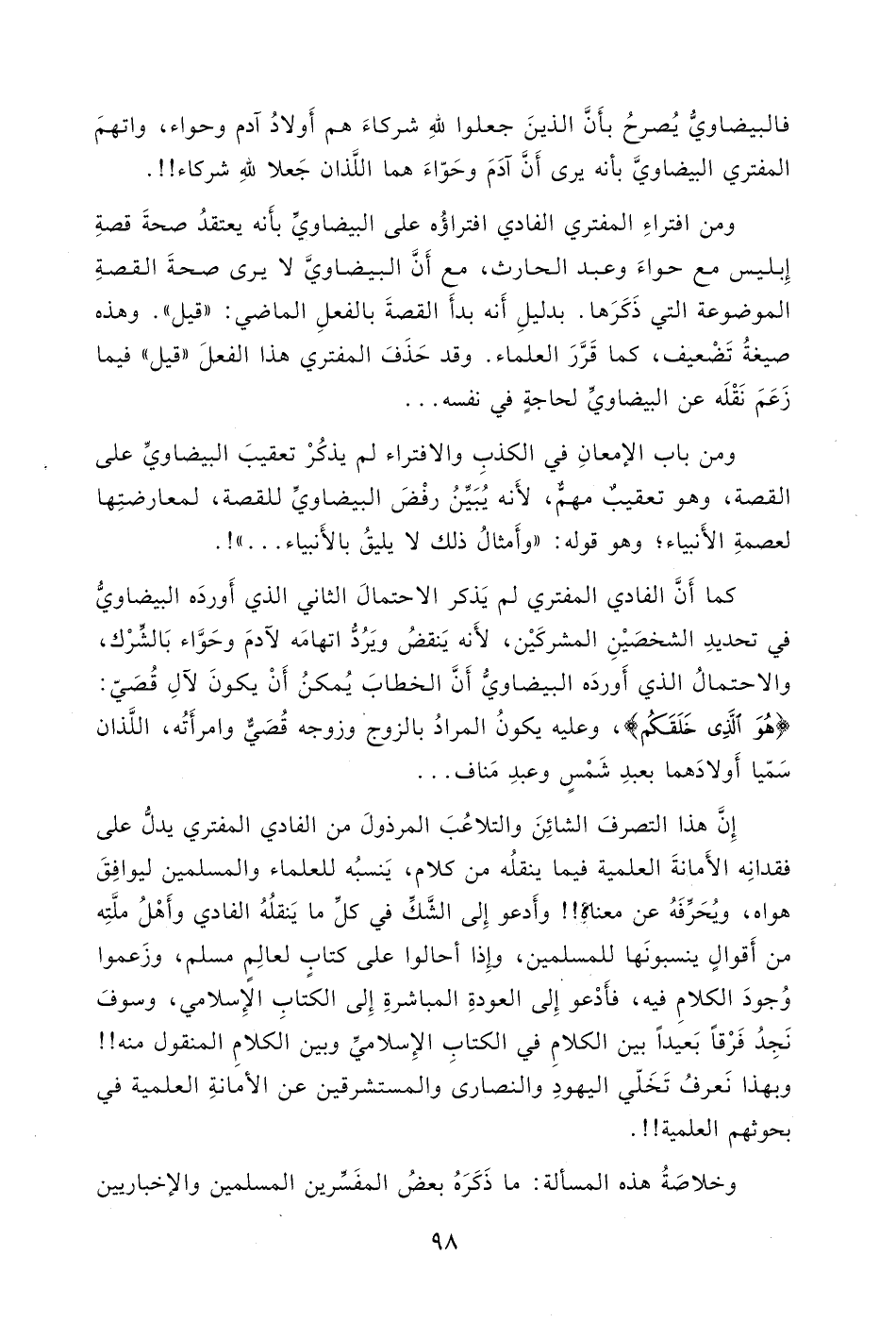 المفترِي البيضاويَّ بأنه يرى أَن آدَمَ وحَواءَ هما اللَّذان جَعلا للهِ شركاء!!.