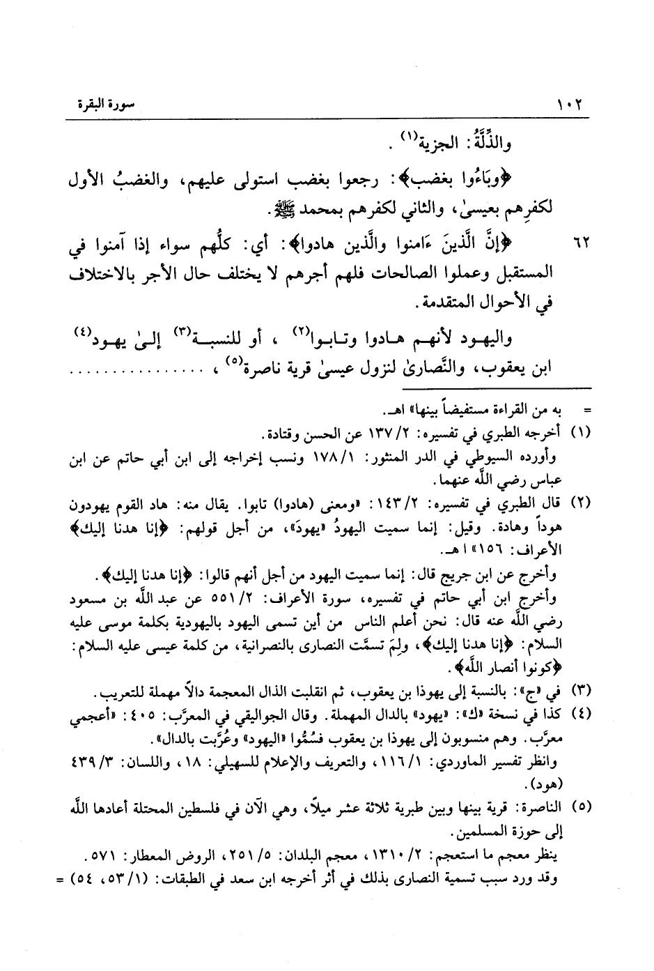 (2) قال الطبري في تفسيره: 2/ 143: «ومعنى (هادوا) تابوا. يقال منه: هاد القوم يهودون هودا وهادة. وقيل: إنما سميت اليهود «يهود» ، من أجل قولهم: إِنَّا هُدْنا إِلَيْكَ الأعراف: 156» اهـ.