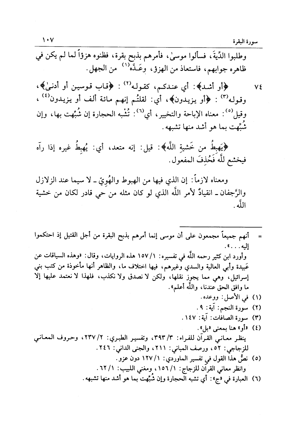 74 أَوْ أَشَدُّ: أي عندكم، كقوله «2» : قابَ قَوْسَيْنِ أَوْ أَدْنى، وقوله «3» : أَوْ يَزِيدُونَ، أي: لقلتم إنهم مائة ألف أو يزيدون «4» ، وقيل «5» : معناه الإباحة والتخيير، أي «6» : تشبه الحجارة إن شبّهت بها، وإن شبّهت بما هو أشد منها تشبهه.