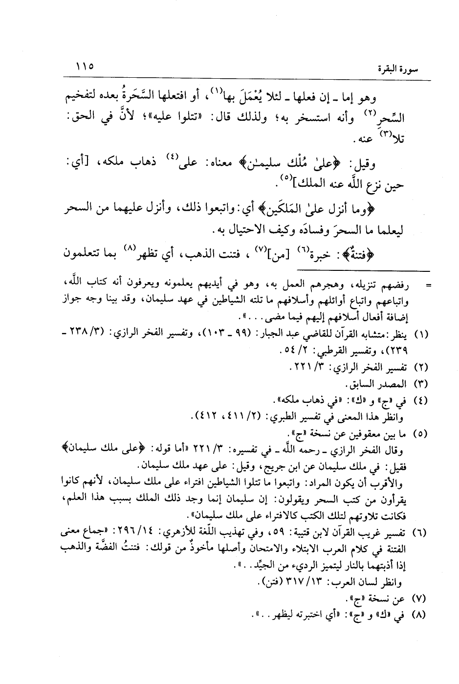 وقال الفخر الرازي- رحمه الله- في تفسيره: 3/ 221 «أما قوله: عَلى مُلْكِ سُلَيْمانَ فقيل: في ملك سليمان عن ابن جريج، وقيل: على عهد ملك سليمان.