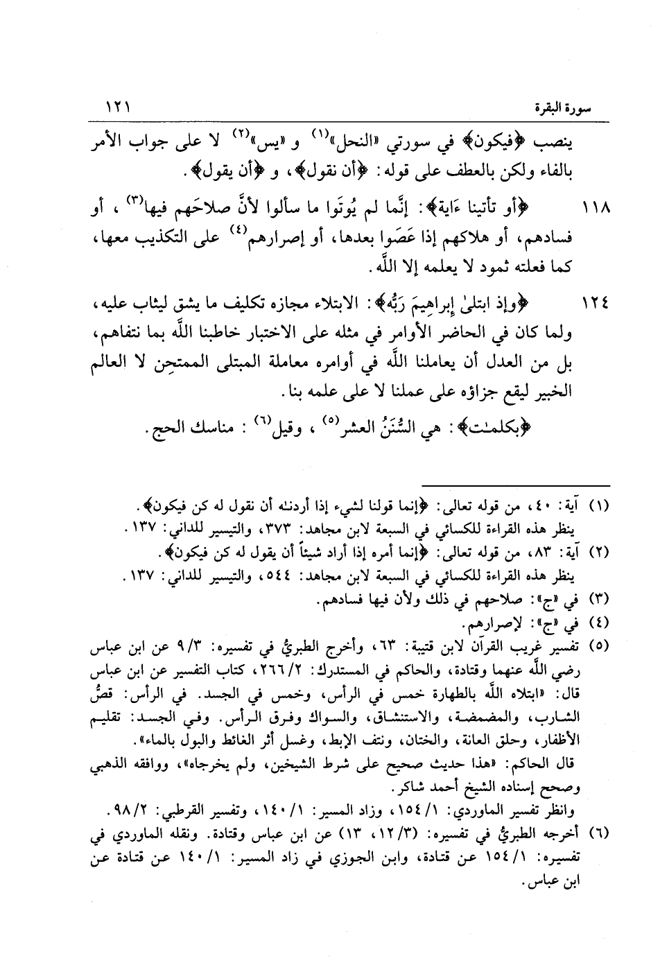 (5) تفسير غريب القرآن لابن قتيبة: 63، وأخرج الطبريّ في تفسيره: 3/ 9 عن ابن عباس رضي الله عنهما وقتادة، والحاكم في المستدرك: 2/ 266، كتاب التفسير عن ابن عباس قال: «ابتلاه الله بالطهارة خمس في الرأس، وخمس في الجسد. في الرأس: قصّ الشارب، والمضمضة، والاستنشاق، والسواك وفرق الرأس. وفي الجسد: تقليم الأظفار، وحلق العانة، والختان، ونتف الإبط، وغسل أثر الغائط والبول بالماء» .