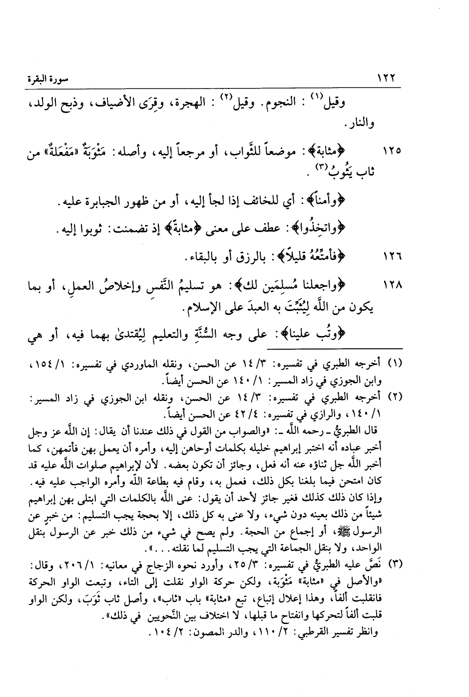 125 مَثابَةً: موضعا للثّواب، أو مرجعا إليه، وأصله: مثوبة «مفعلة» من ثاب يثوب «3» .