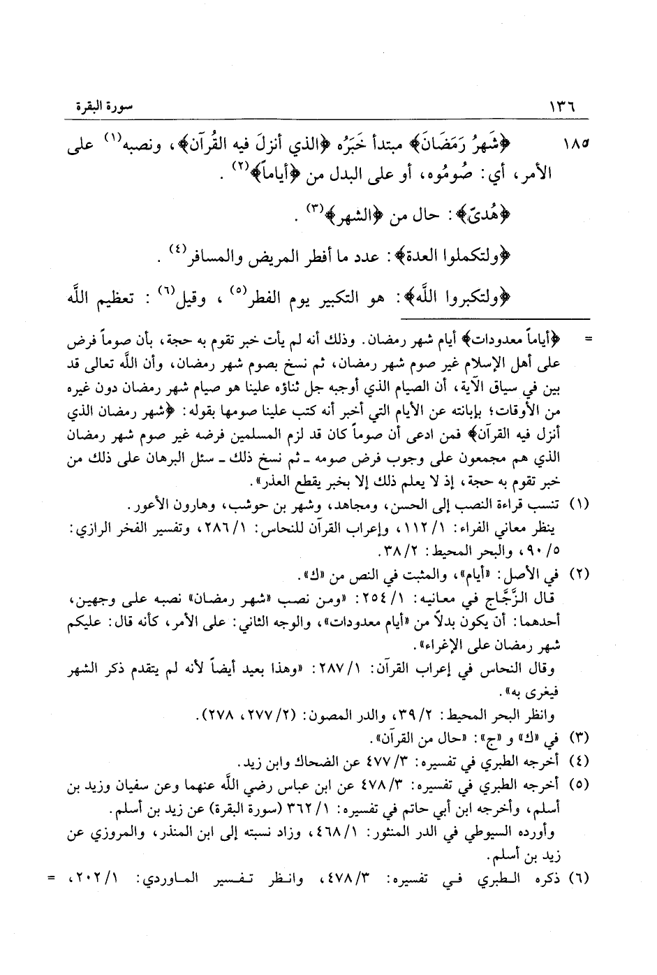 185 شَهْرُ رَمَضانَ مبتدأ خبره الَّذِي أُنْزِلَ فِيهِ الْقُرْآنُ، ونصبه «1» على الأمر، أي: صوموه، أو على البدل من أَيَّاماً «2» .