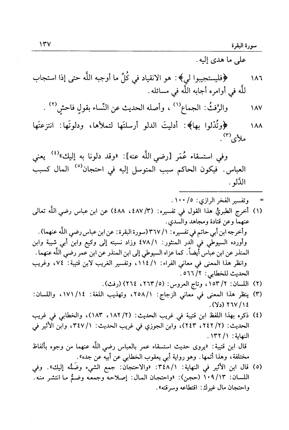 وفي استسقاء عمر [رضي الله عنه] : «وقد دلونا به إليك» «4» يعني العباس. فيكون الحاكم سبب المتوسل إليه في احتجان «5» المال كسبب الدّلو.