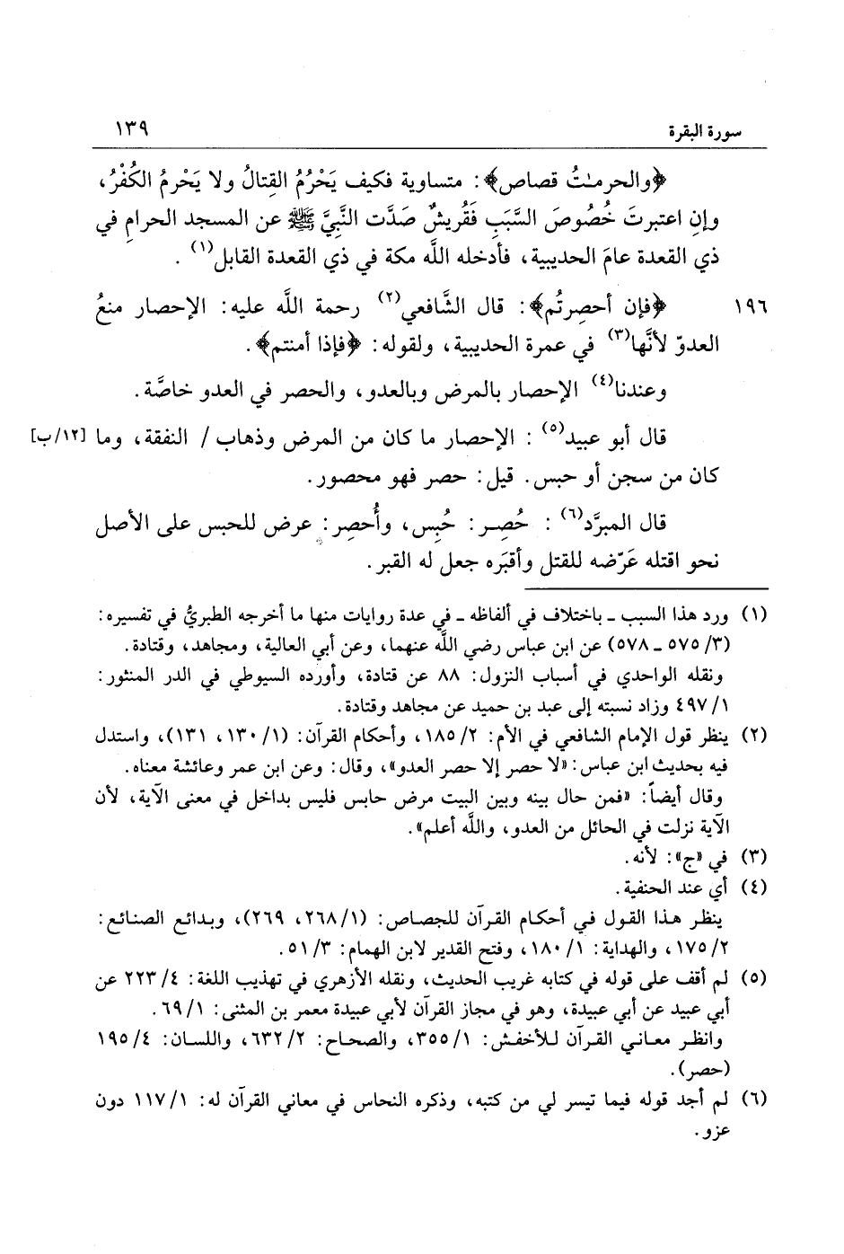 (2) ينظر قول الإمام الشافعي في الأم: 2/ 185، وأحكام القرآن: (1/ 130، 131) ، واستدل فيه بحديث ابن عباس: «لا حصر إلا حصر العدو» ، وقال: وعن ابن عمر وعائشة معناه.