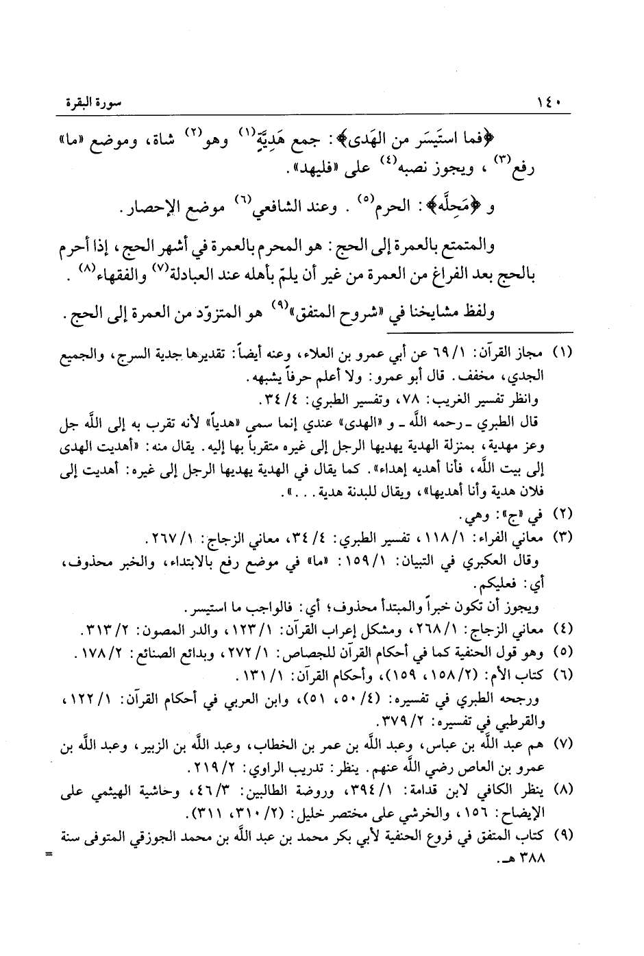فَمَا اسْتَيْسَرَ مِنَ الْهَدْيِ: جمع هديّة «1» وهو «2» شاة، وموضع «ما» رفع «3» ، ويجوز نصبه «4» على «فليهد» .