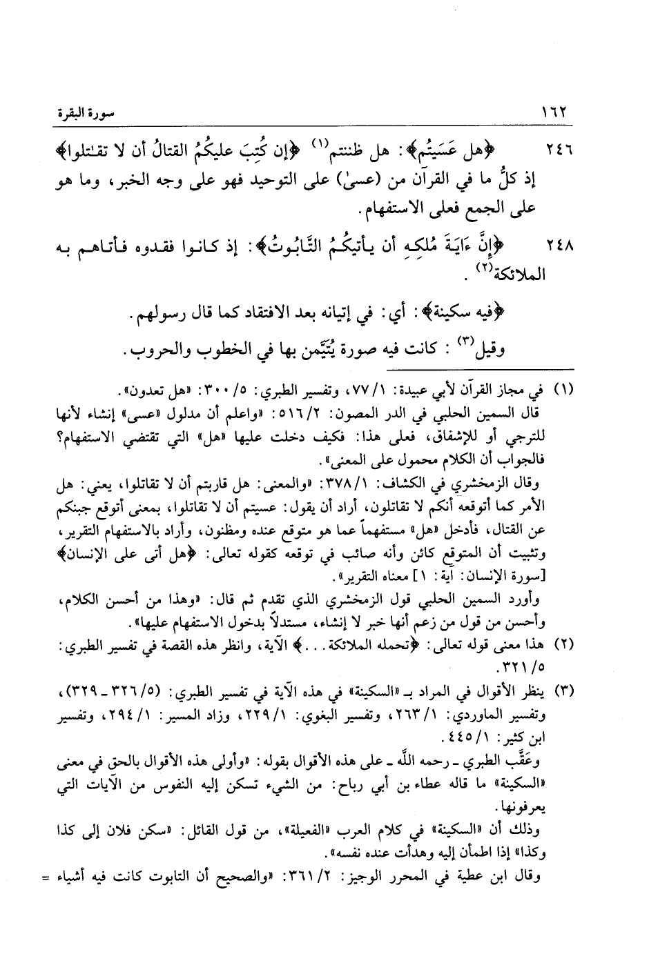 (3) ينظر الأقوال في المراد ب «السكينة» في هذه الآية في تفسير الطبري: (5/ 326- 329) ، وتفسير الماوردي: 1/ 263، وتفسير البغوي: 1/ 229، وزاد المسير: 1/ 294، وتفسير ابن كثير: 1/ 445.