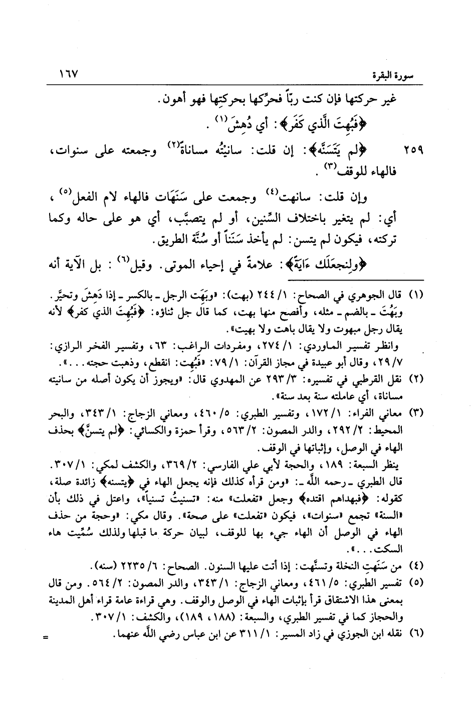 259 لَمْ يَتَسَنَّهْ: إن قلت: سانيته مساناة «2» وجمعته على سنوات، فالهاء للوقف «3» .