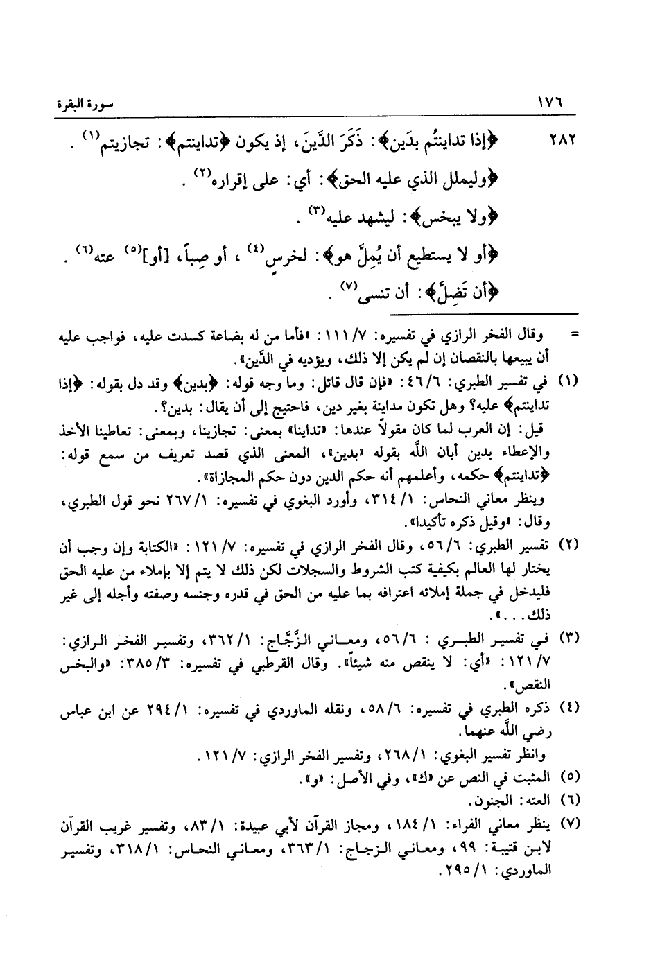 (2) تفسير الطبري: 6/ 56، وقال الفخر الرازي في تفسيره: 7/ 121: «الكتابة وإن وجب أن يختار لها العالم بكيفية كتب الشروط والسجلات لكن ذلك لا يتم إلا بإملاء من عليه الحق فليدخل في جملة إملائه اعترافه بما عليه من الحق في قدره وجنسه وصفته وأجله إلى غير ذلك ... » .