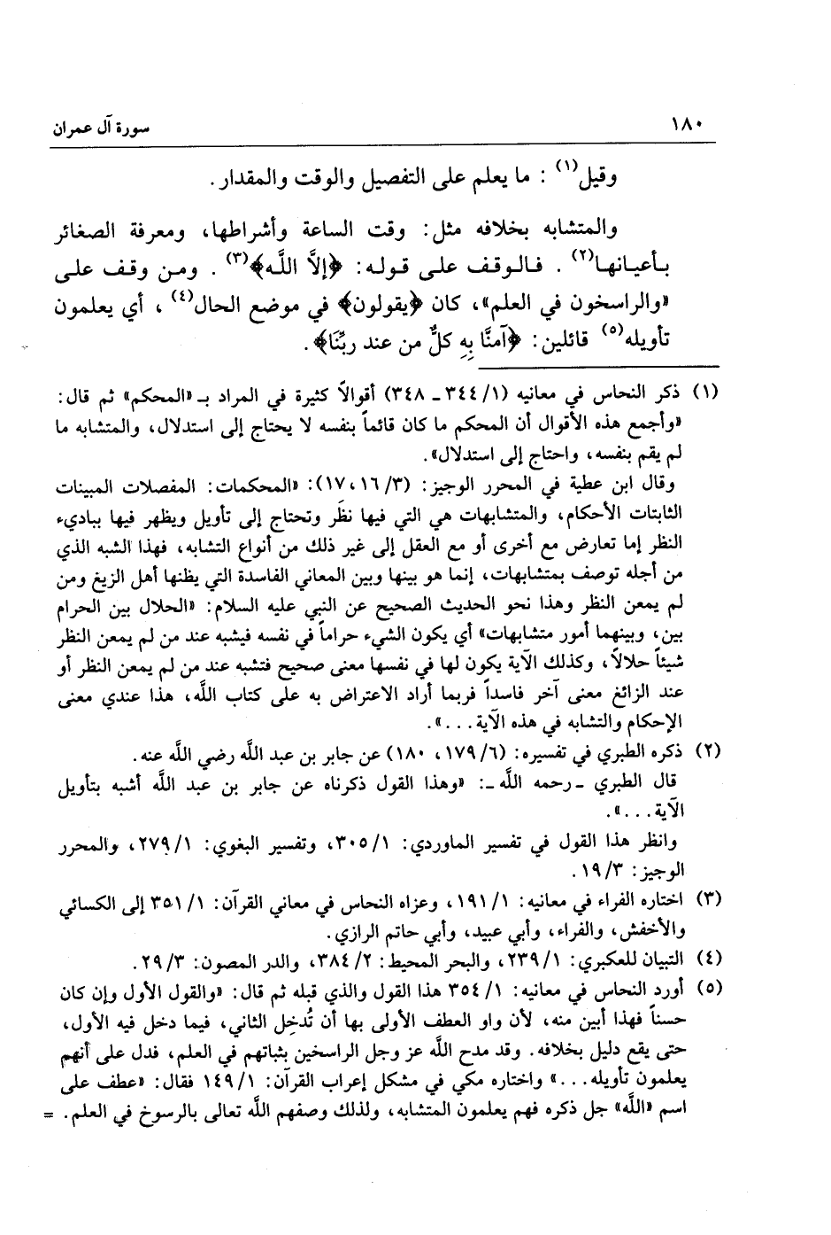 (5) أورد النحاس في معانيه: 1/ 354 هذا القول والذي قبله ثم قال: «والقول الأول وإن كان حسنا فهذا أبين منه، لأن واو العطف الأولى بها أن تدخل الثاني، فيما دخل فيه الأول، حتى يقع دليل بخلافه. وقد مدح الله عز وجل الراسخين بثباتهم في العلم، فدخل على أنهم يعلمون تأويله ... » واختاره مكي في مشكل إعراب القرآن: 1/ 149 فقال: «عطف على اسم «الله» جل ذكره فهم يعلمون المتشابه، ولذلك وصفهم الله تعالى بالرسوخ في العلم.
