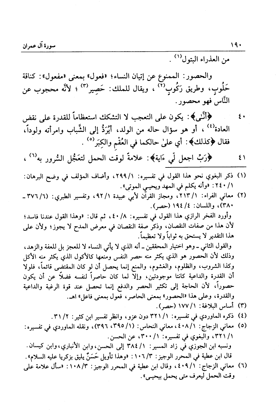 والقول الثاني- وهو اختيار المحققين- أنه الذي لا يأتي النساء لا للعجز بل للعفة والزهد، وذلك لأن الحصور هو الذي يكثر منه حصر النفس ومنعها كالأكول الذي يكثر منه الأكل وكذا الشروب، والظلوم، والغشوم، والمنع إنما يحصل أن لو كان المقتضى قائما، فلولا أن القدرة والداعية كانتا موجودتين، وإلا لما كان حاصرا لنفسه فضلا عن أن يكون حصورا، لأن الحاجة إلى تكثير الحصر والدفع إنما تحصل عند قوة الرغبة والداعية والقدرة، وعلى هذا «الحصور» بمعنى الحاصر، فعول بمعنى فاعل» اهـ.