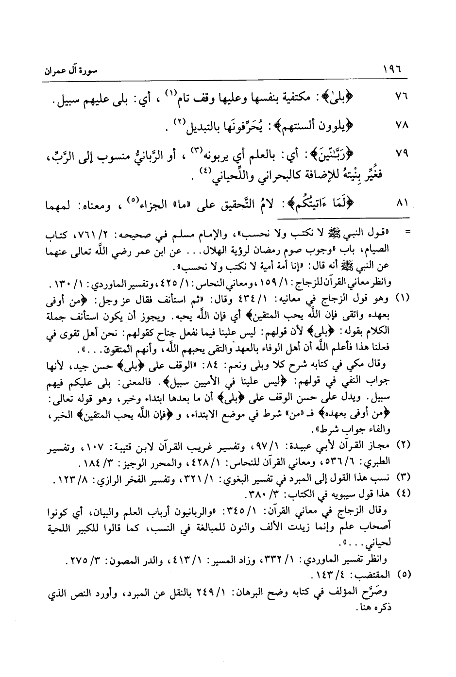 79 رَبَّانِيِّينَ: أي: بالعلم أي يربونه «3» ، أو الرّبانيّ منسوب إلى الرّبّ، فغيّر بنيته للإضافة كالبحراني واللّحياني «4» .