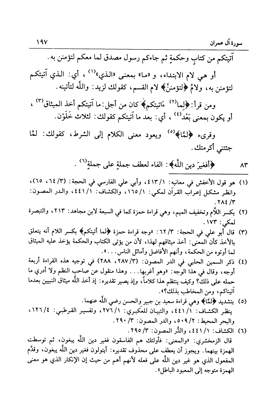 (3) قال أبو علي في الحجة: 3/ 62: «وجه قراءة حمزة لما أتيتكم بكسر اللام أنه يتعلق بالأخذ كأن المعنى: أخذ ميثاقهم لهذا، لأن من يؤتى الكتاب والحكمة يؤخذ عليه الميثاق لما أوتوه من الحكمة، وأنهم الأفاضل وأماثل الناس ... » .
