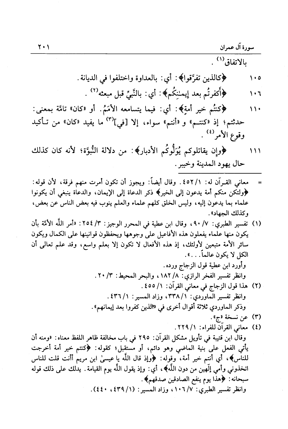 (1) تفسير الطبري: 7/ 90، وقال ابن عطية في المحرر الوجيز: 3/ 254: «أمر الله الأمّة بأن يكون منها علماء يفعلون هذه الأفاعيل على وجوهها ويحفظون قوانينها على الكمال ويكون سائر الأمة متبعين لأولئك، إذ هذه الأفعال لا تكون إلا بعلم واسع، وقد علم تعالى أن الكل لا يكون عالما ... » .