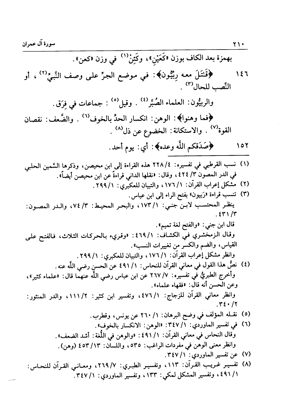 146 قاتَلَ مَعَهُ رِبِّيُّونَ: في موضع الجرّ على وصف النّبيّ «2» ، أو النّصب للحال «3» .