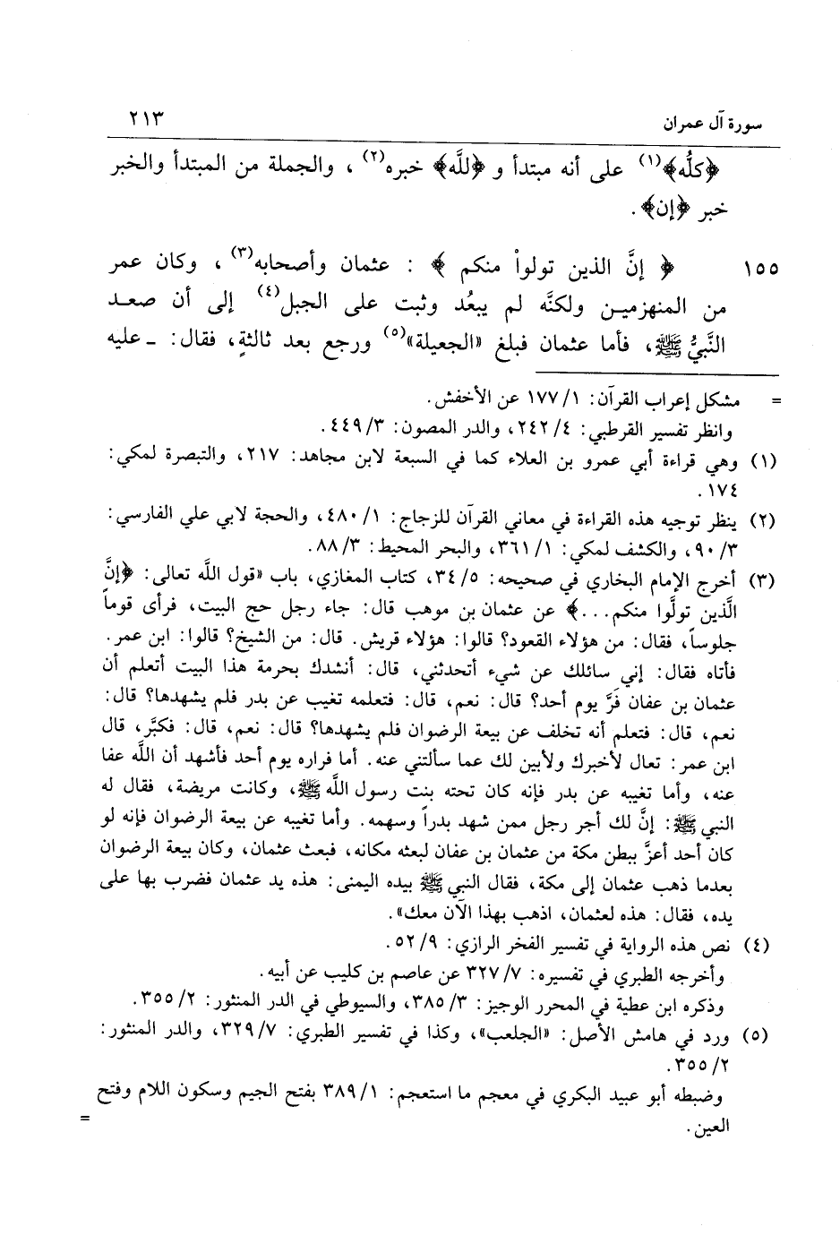 155 إِنَّ الَّذِينَ تَوَلَّوْا مِنْكُمْ: عثمان وأصحابه «3» ، وكان عمر من المنهزمين ولكنّه لم يبعد وثبت على الجبل «4» إلى أن صعد النّبيّ صلّى الله عليه وسلّم، فأما عثمان فبلغ «الجعيلة» «5» ورجع بعد ثالثة، فقال: - عليه