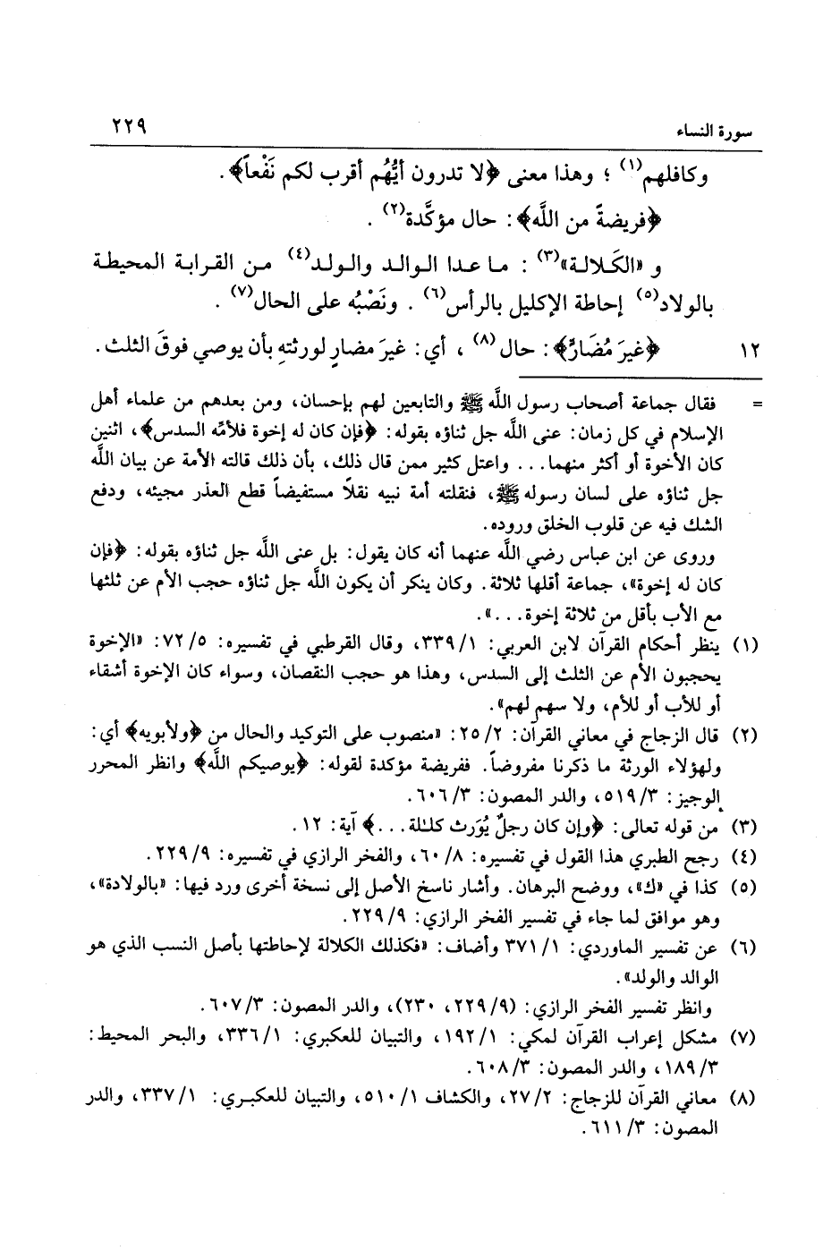 (6) عن تفسير الماوردي: 1/ 371 وأضاف: «فكذلك الكلالة لإحاطتها بأصل النسب الذي هو الوالد والولد» .