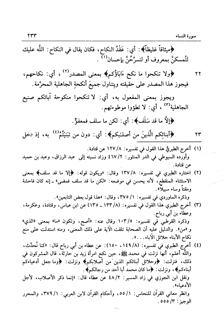 (4) أخرج الطبري في تفسيره: (8/ 149، 150) : عن عطاء بن أبي رباح قال: «كنا نحدّث، والله أعلم، أنها نزلت في محمد صلّى الله عليه وسلّم، حين نكح امرأة زيد بن حارثة، قال المشركون في ذلك، فنزلت: وَحَلائِلُ أَبْنائِكُمُ الَّذِينَ مِنْ أَصْلابِكُمْ ونزلت: وَما جَعَلَ أَدْعِياءَكُمْ أَبْناءَكُمْ، ونزلت: ما كانَ مُحَمَّدٌ أَبا أَحَدٍ مِنْ رِجالِكُمْ.