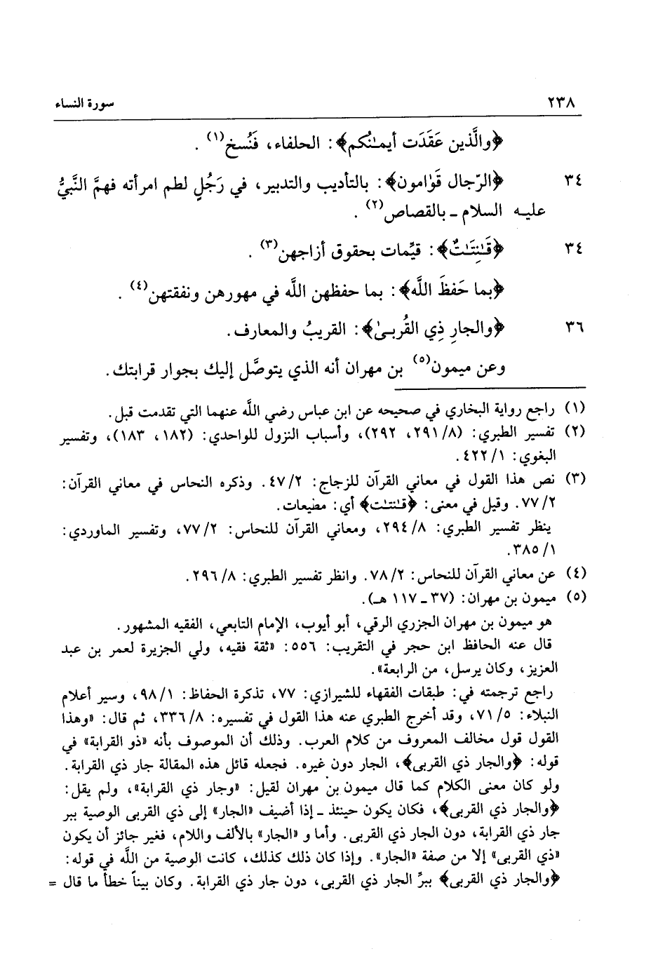 راجع ترجمته في: طبقات الفقهاء للشيرازي: 77، تذكرة الحفاظ: 1/ 98، وسير أعلام النبلاء: 5/ 71، وقد أخرج الطبري عنه هذا القول في تفسيره: 8/ 336، ثم قال: «وهذا القول قول مخالف المعروف من كلام العرب. وذلك أن الموصوف بأنه «ذو القرابة» في قوله: وَالْجارِ ذِي الْقُرْبى، الجار دون غيره. فجعله قائل هذه المقالة جار ذي القرابة.