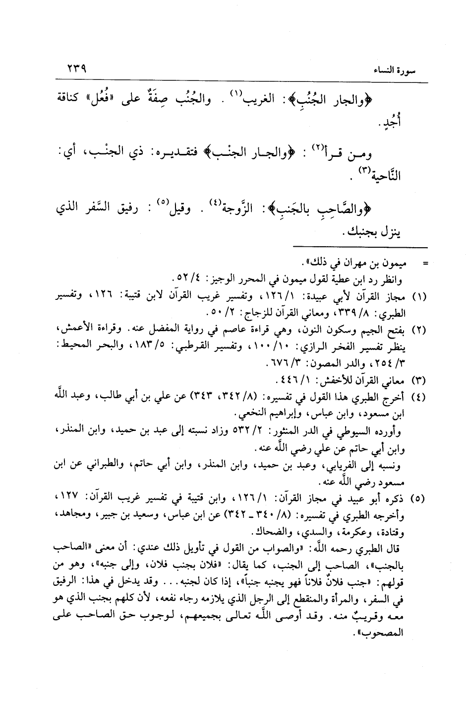 وَالصَّاحِبِ بِالْجَنْبِ: الزّوجة «4» . وقيل «5» : رفيق السّفر الذي ينزل بجنبك.