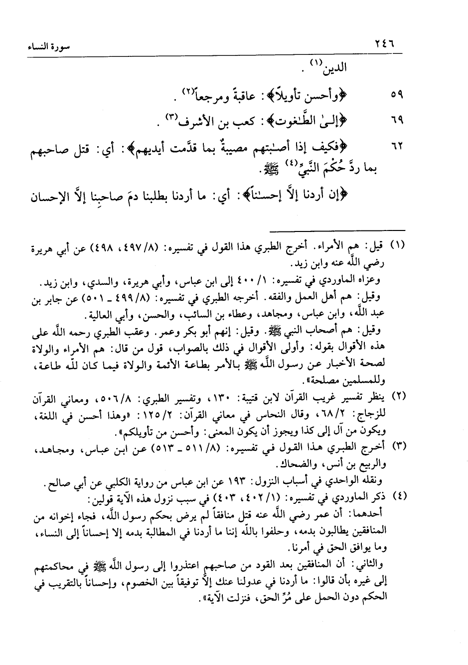 والثاني: أن المنافقين بعد القود من صاحبهم اعتذروا إلى رسول الله صلّى الله عليه وسلّم في محاكمتهم إلى غيره بأن قالوا: ما أردنا في عدولنا عنك إلّا توفيقا بين الخصوم، وإحسانا بالتقريب في الحكم دون الحمل على مرّ الحق، فنزلت الآية» . [.....]