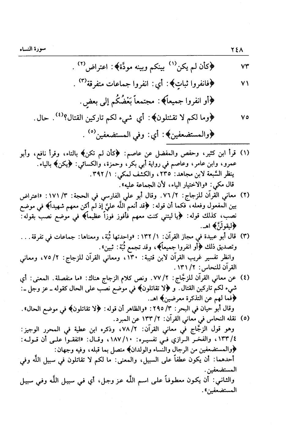 (4) عن معاني القرآن للزجّاج: 2/ 77. ونص كلام الزجاج هناك: «ما منفصلة. المعنى: أي شيء لكم تاركين القتال. ولا تُقاتِلُونَ في موضع نصب على الحال كقوله- عز وجل-:
