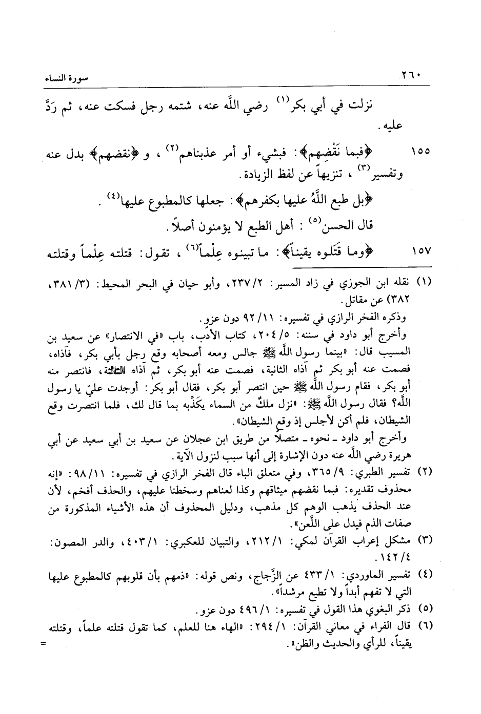 (2) تفسير الطبري: 9/ 365، وفي متعلق الباء قال الفخر الرازي في تفسيره: 11/ 98: «إنه محذوف تقديره: فبما نقضهم ميثاقهم وكذا لعناهم وسخطنا عليهم، والحذف أفخم، لأن عند الحذف يذهب الوهم كل مذهب، ودليل المحذوف أن هذه الأشياء المذكورة من صفات الذم فيدل على اللّعن» .